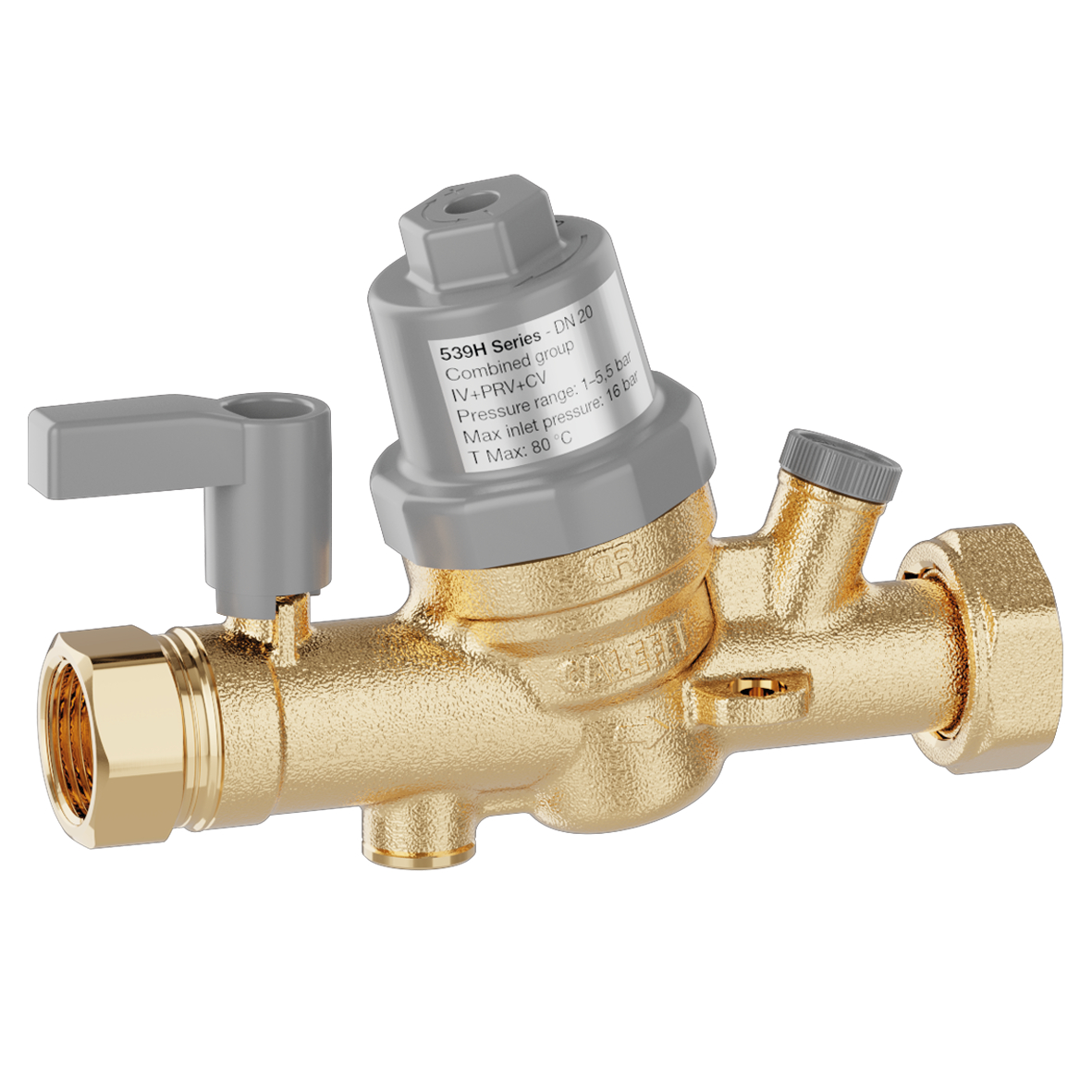 卡莱菲,539050H。冷热水减压止回阀组。高温型。球阀加长手柄。EA型止回阀。上下游压力表接口G 1/4"。EN 1567认证减压阀。符合规范 EN 13959。入水接口: Rp 3/4" (EN 10226-1) F。出水接口: G 1" (ISO 228-1) F,活接。耐压: 16 bar。可调温度范围: 2–80 °C。下游可调压力:1–5.5 bar。阀体: 低铅防脱锌铜合金 DR "low lead"。